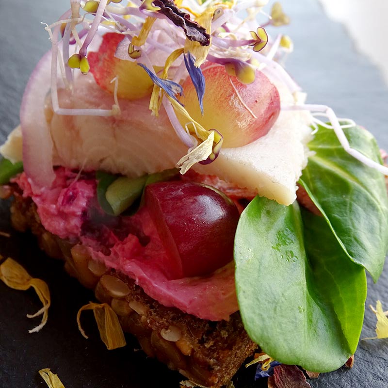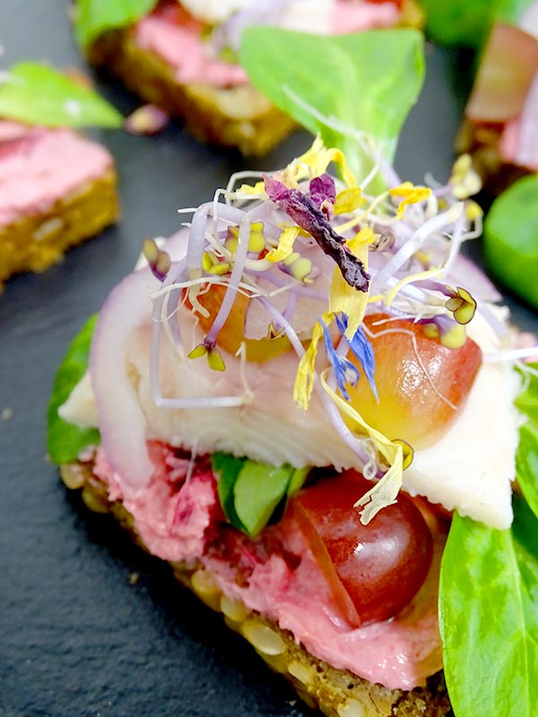 Canapé mit Forelle, Rote Bete, rote Zwiebel, Meerrettich, Traube, Salat, Kresse