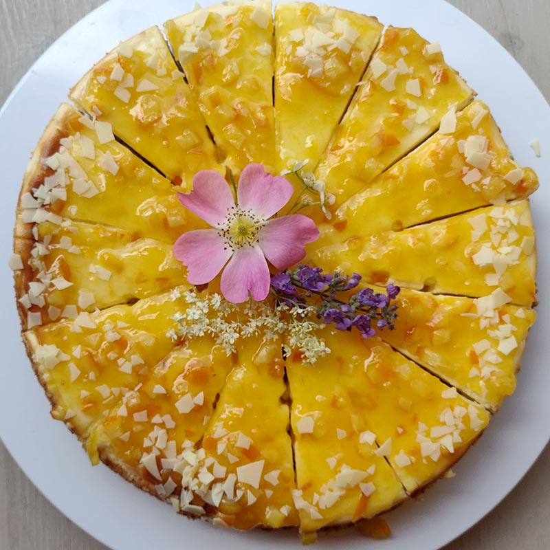 Käsekuchen (26 cm Durchmesser, 12 Stücke) mit Zitronentopping, liebevoll ausdekoriert
