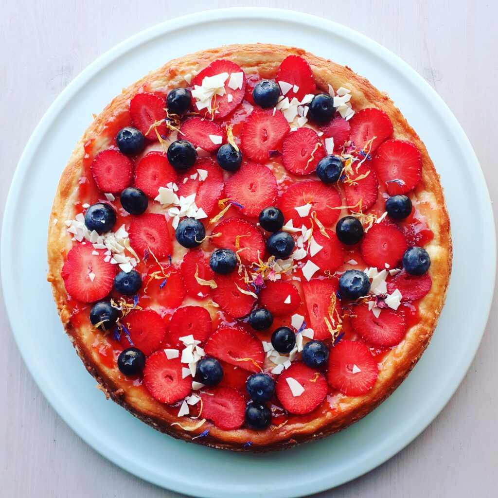Käsekuchen (26 cm Durchmesser, 12 Stücke) mit Fruchttopping (zum Beispiel: Kirsche, Himbeere etc.), liebevoll ausdekoriert