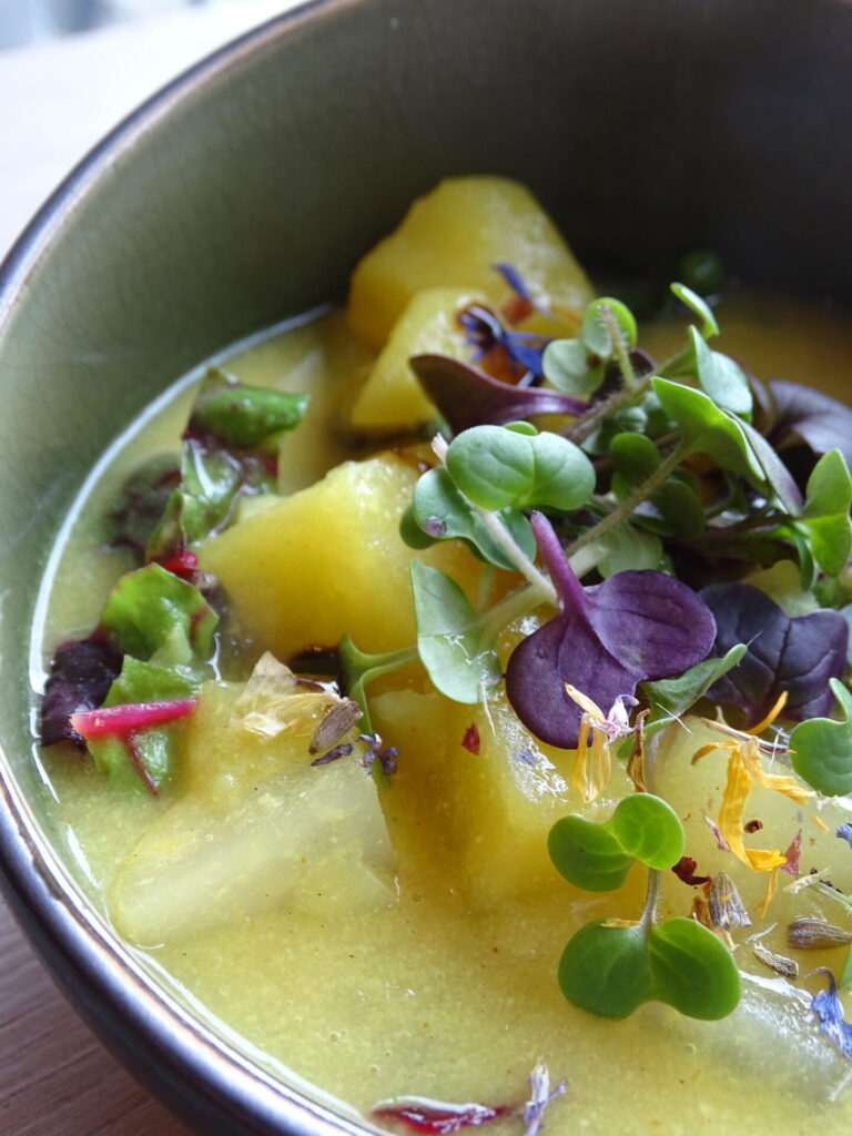 Wirsing mit Zwiebeln, Möhren, Kartoffeln, Tomatenmark. Mayonnaise aus Senf, Sojamilch, Rapsöl und Curry