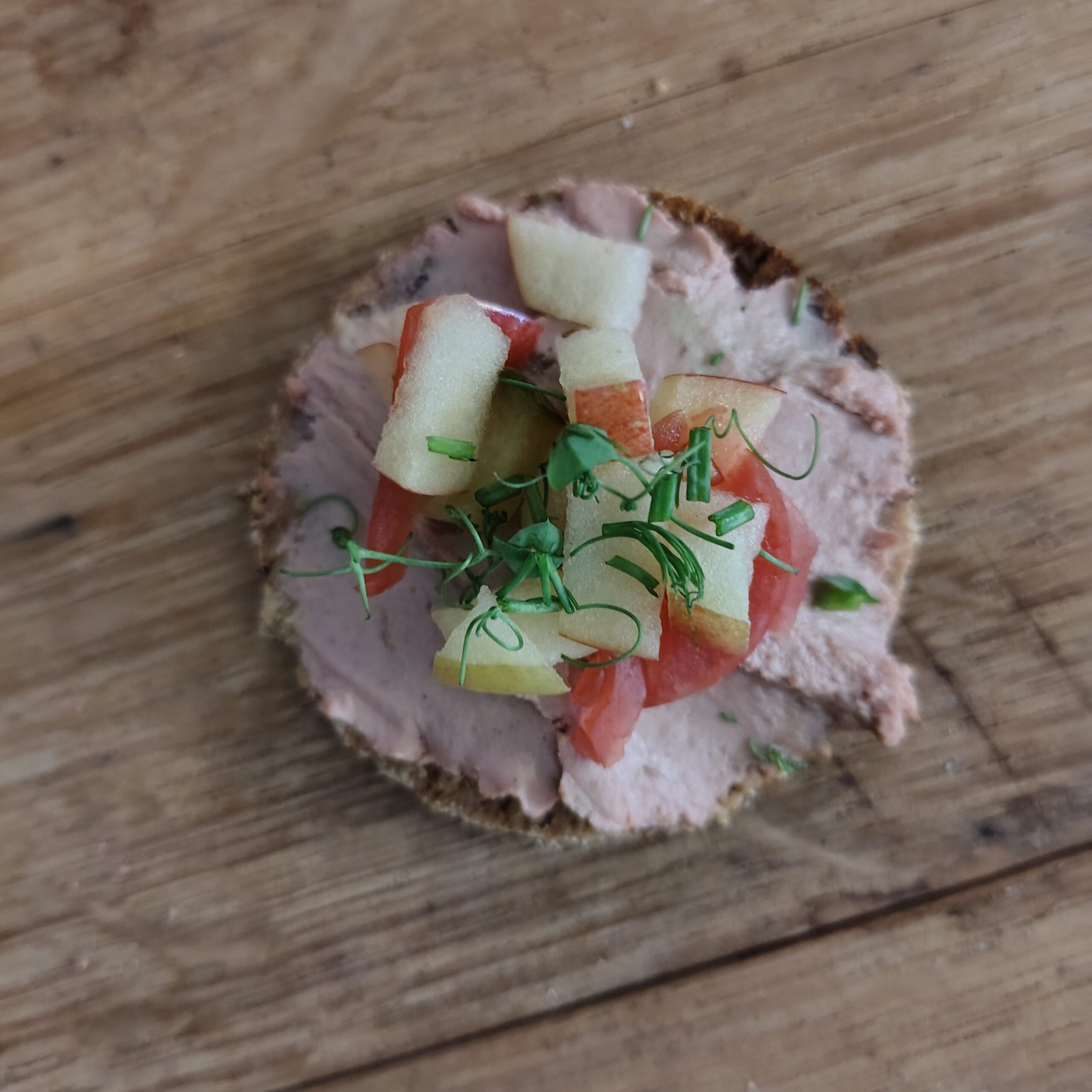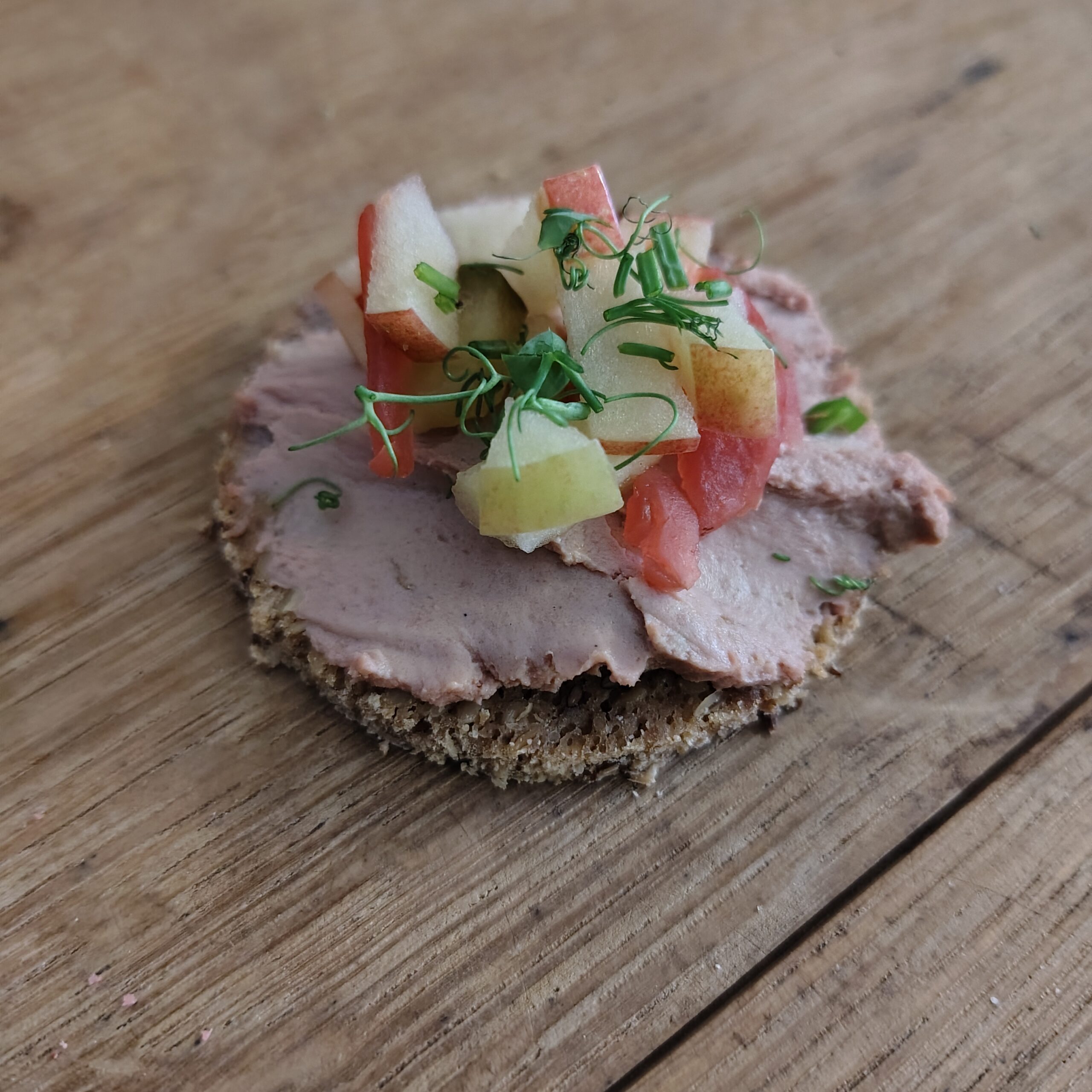 Bio-Vollkornbrot mit Leberwurst in Bioqualität mit einem Topping aus eingelegten Gurken, Apfel und gepickelten Radieschen.