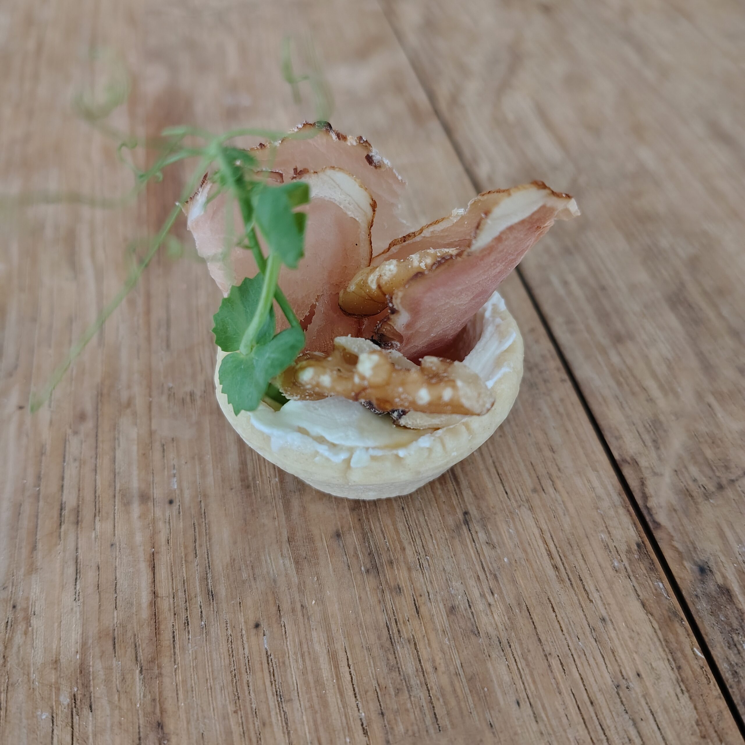 Rohgeräucherter Bio-Lachsschinken (Buchenholz) im Mürbteig-Tartelette mit karamelisierter Walnuss und Frischkäse.