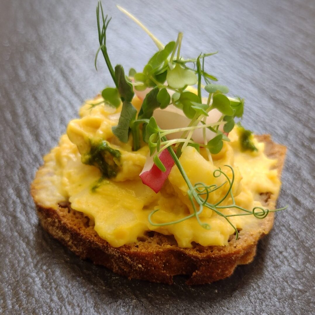 Bio-Roggenbrot aus Natursauerteig mit veganem Eiersalat aus Kichererbsen, Rauchsalz, Mayonnaise mit Orange, Koriander, Salat, gepickelte Radieschen, Kresse