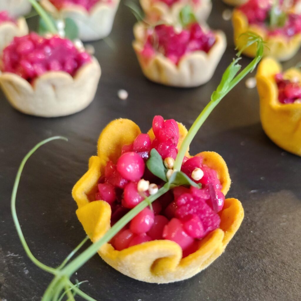 Salat aus Perl-Couscous, Rote Bete, Zwiebel, Apfel und Meerrettich im essbaren Schälchen aus Mürbeteig.