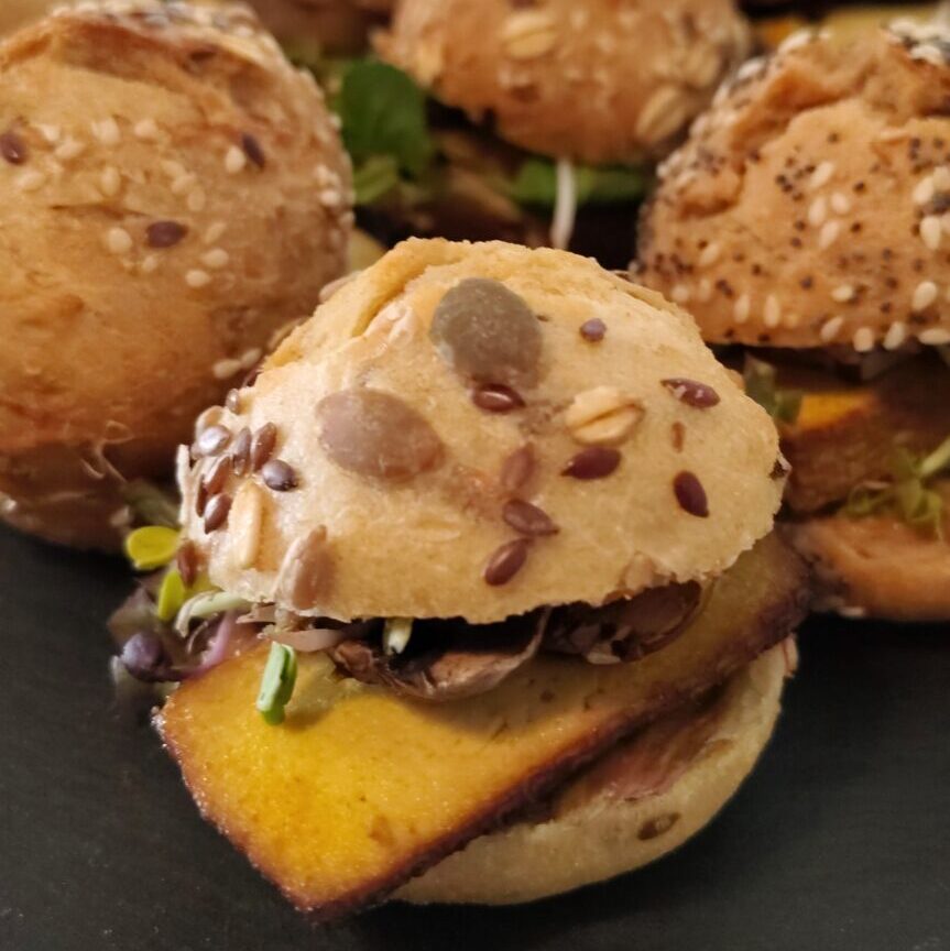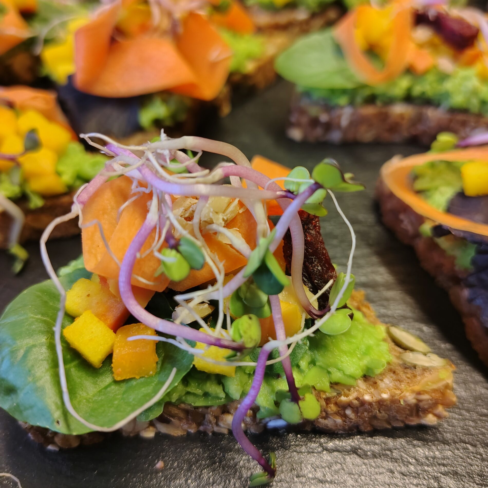 Bio-Walnussbrot aus Natursauerteig mit selbstgemachter Erbsenguacamole, in Kurkuma gebratener Apfel, geraspelte Bio-Möhre, Walnuss, Salat, geräucherte Rote Bete, Kresse (vegan)