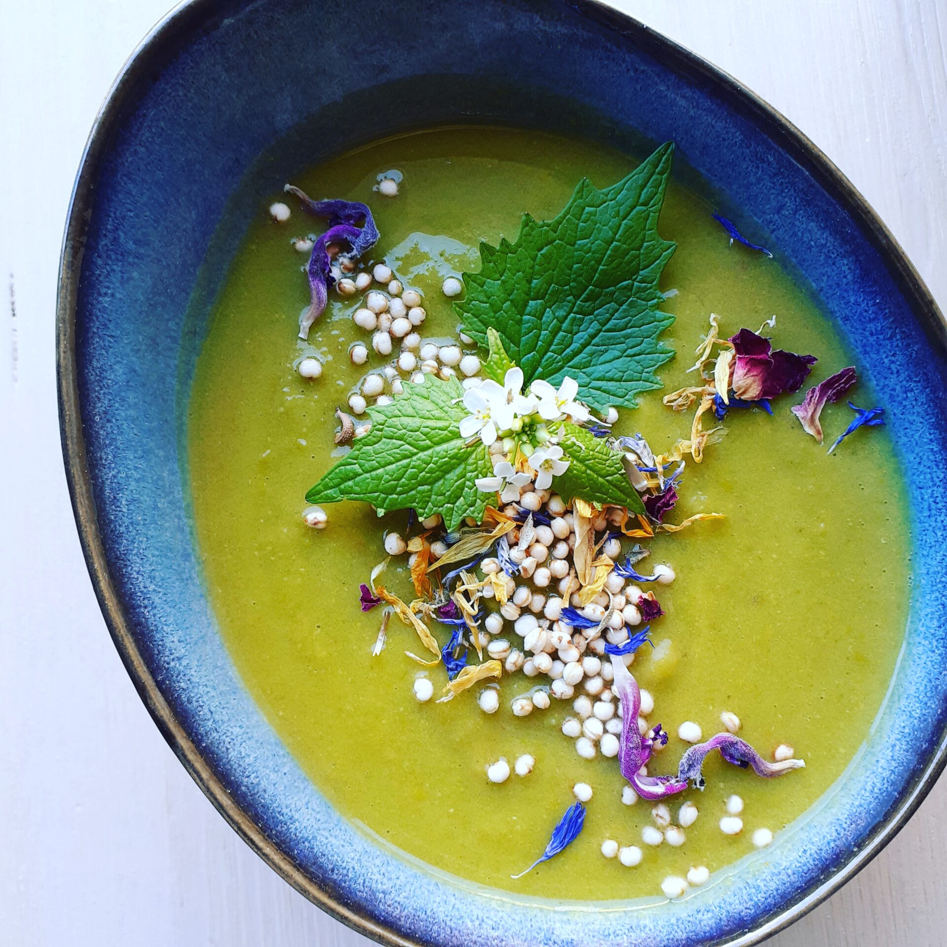 Erbsensuppe mit Apfel: Cremesuppe aus grünen Erbsen, Staudensellerie, Lauch, Apfel, Kurkuma, etwas Chili und Olivenöl.