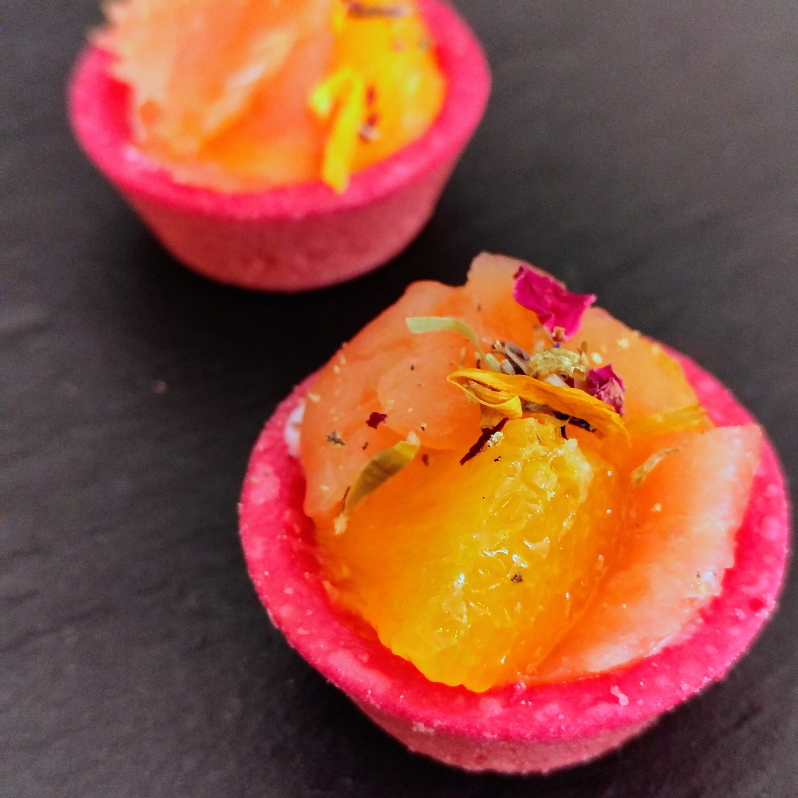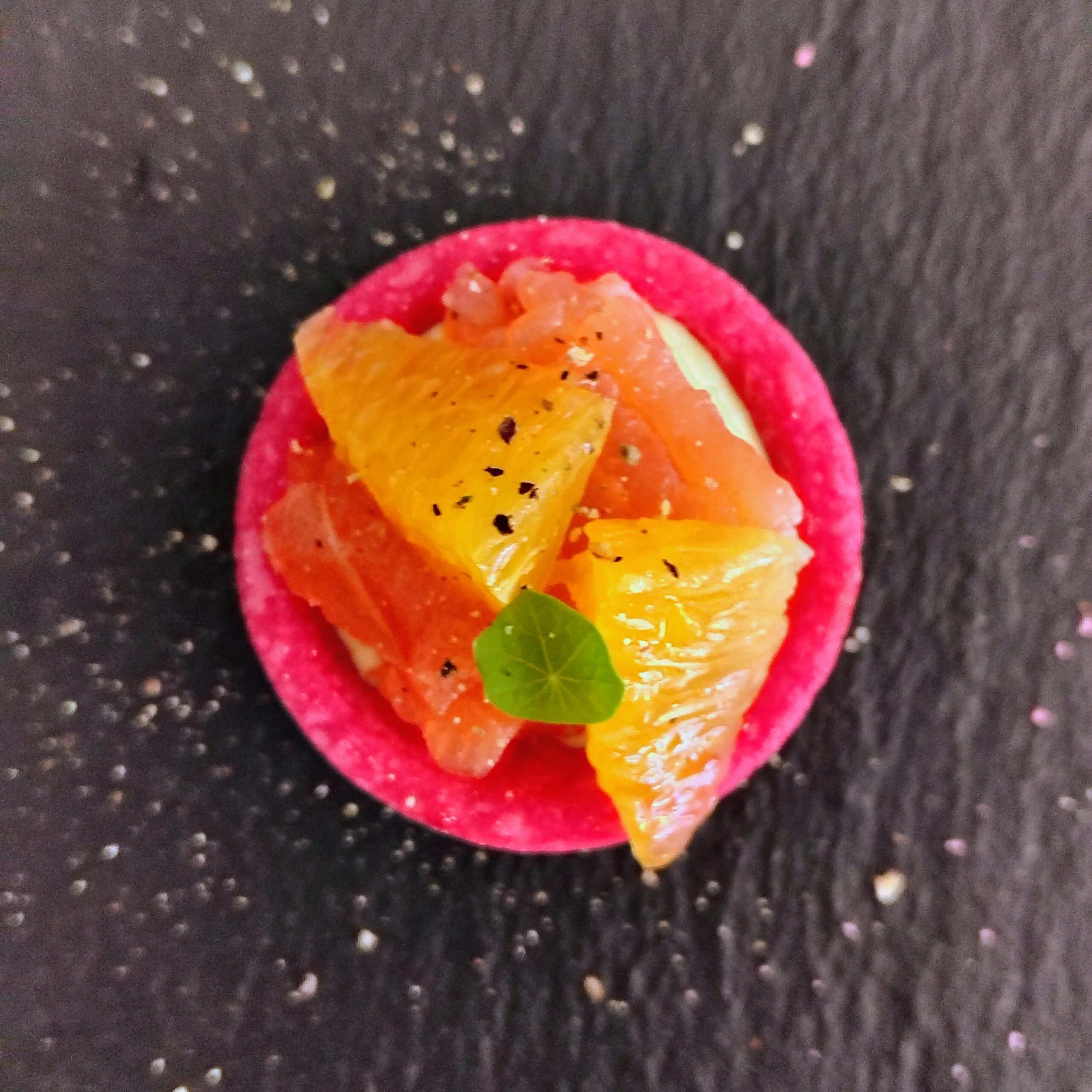 Rote-Bete Snack-Mürbeteig mit gebeiztem Lachs, Orangenfilets und Honig-Senf-Frischkäse