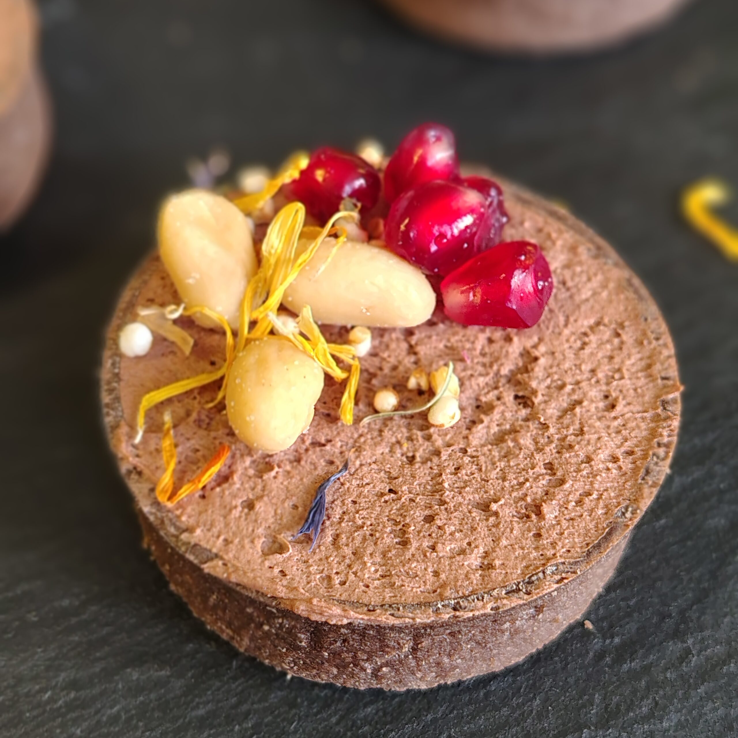Mürbeteig mit Schokofüllung. Liebevoll ausdekoriert mit Obst und Creme (ca. 5,5 cm Durchmesser, Mindestenbestellmenge zehn Stück).