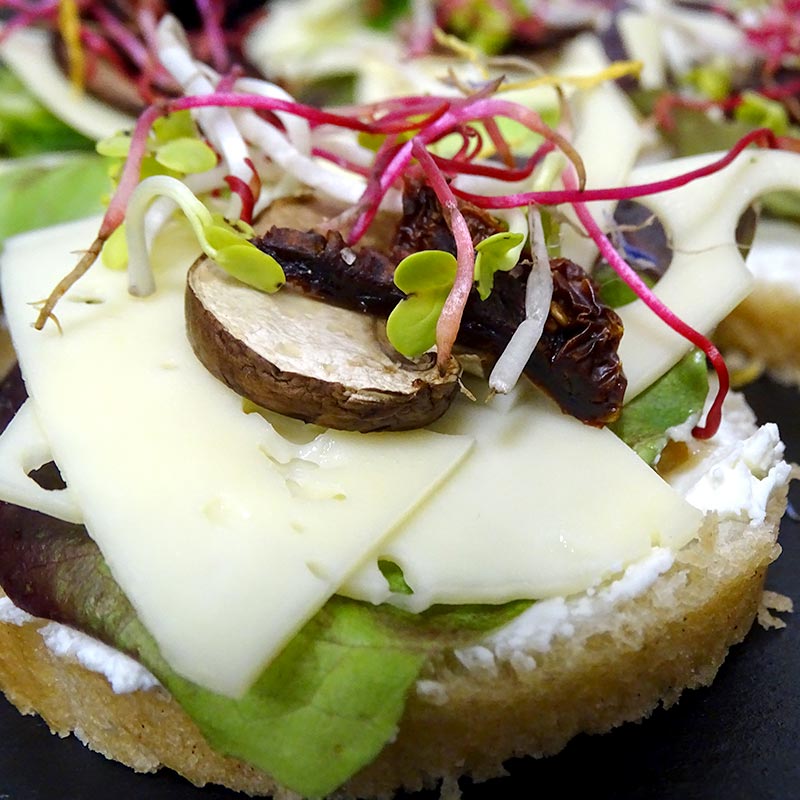 Bio-Walnussbrot aus Natursauerteig mit Bergkäse, gebratene Pilze, getrocknete Tomaten, Bio-Ahornsirup, Salat, Kresse