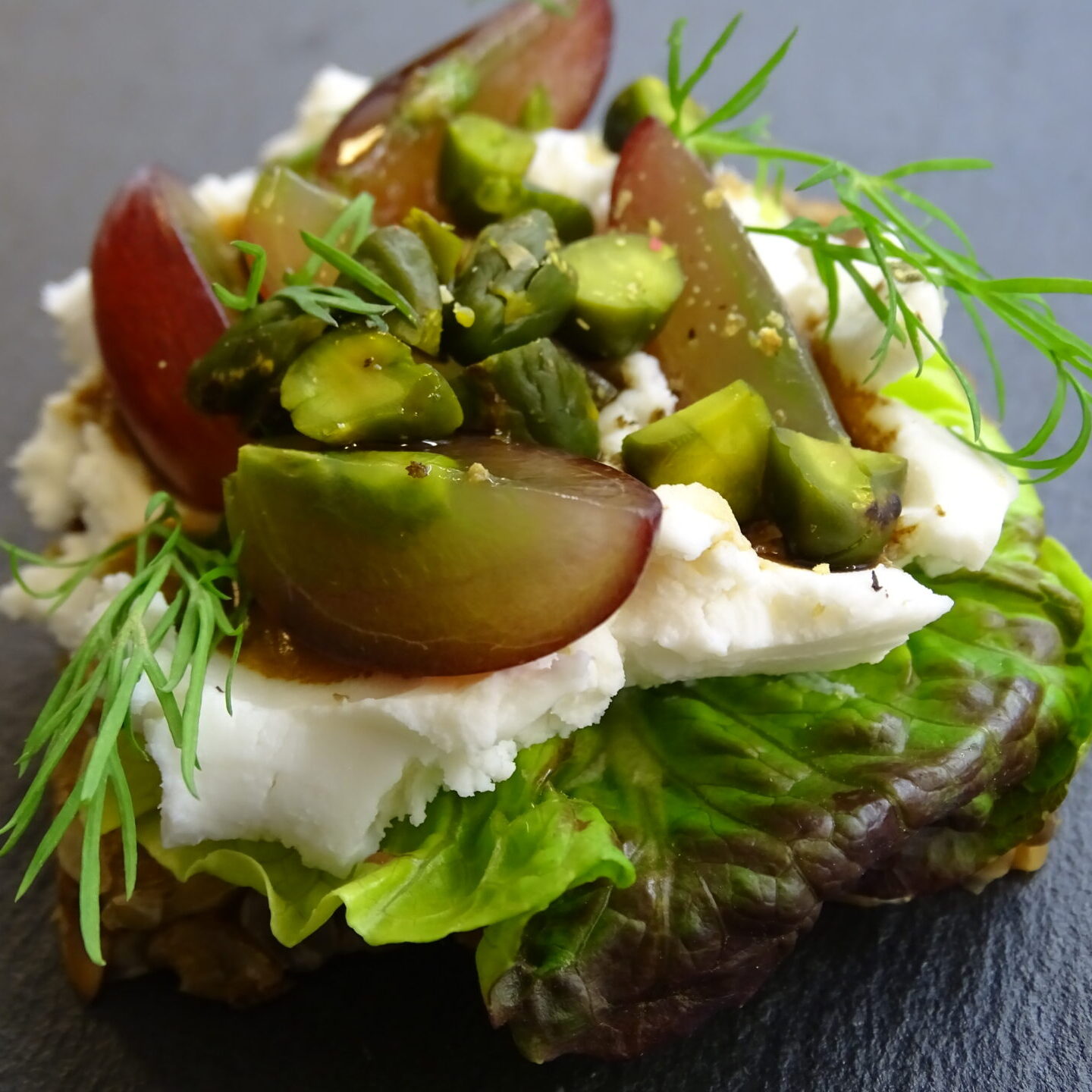 Bio-Weizenmischbrot mit Bio-Schafskäse, Trauben, Dill, Pistazien und Ahornsirup.