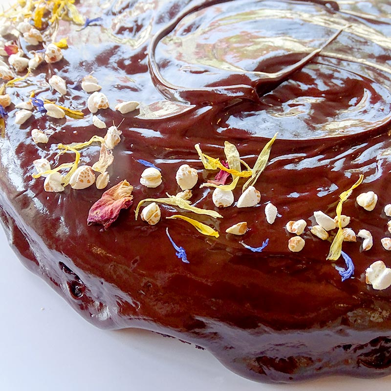 Veganer Browniekuchen (26 cm Durchmesser, 12 Stücke), Erdnusscreme-Topping, Schokoganache; glutenfreundliche Variante verfügbar
