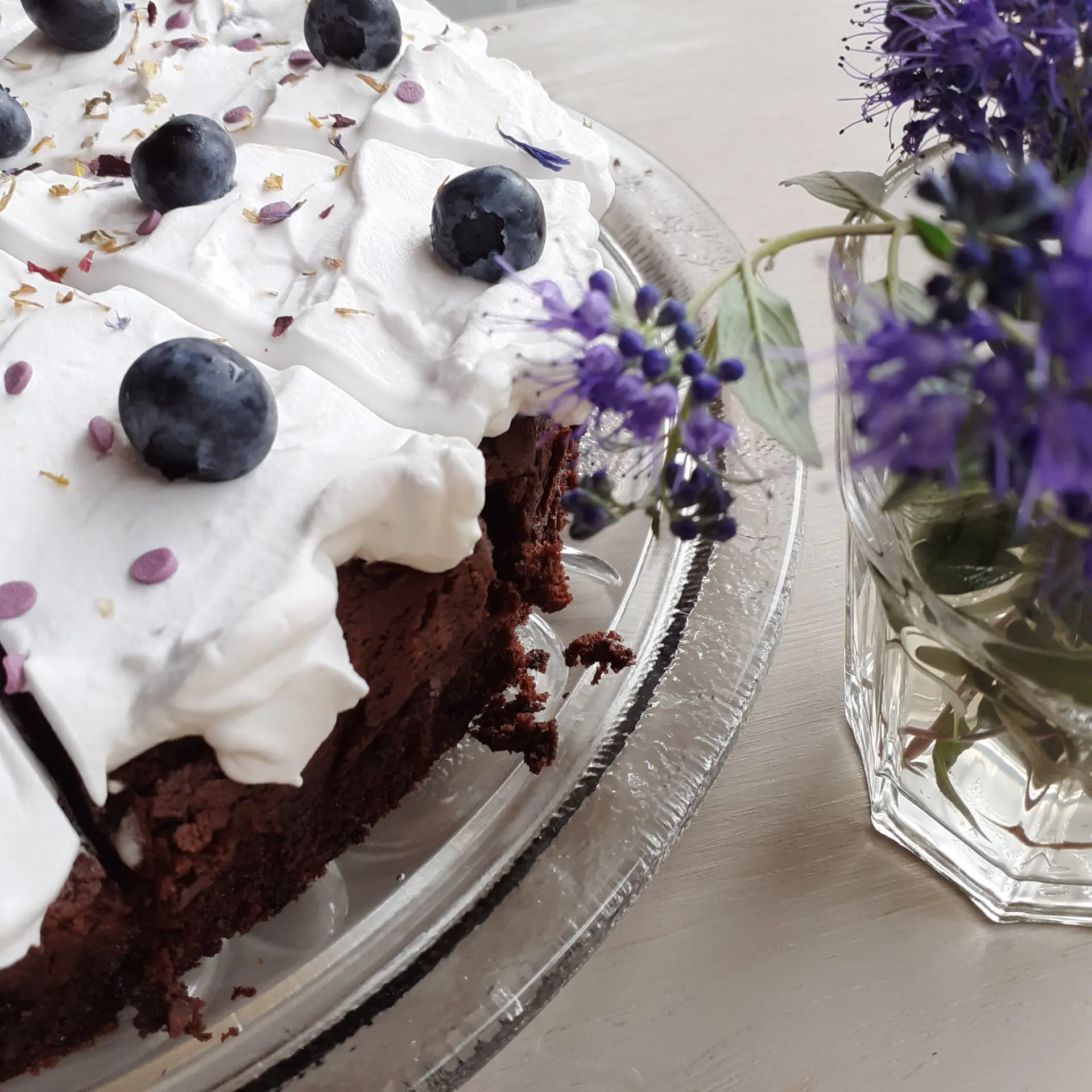 Browniekuchen (26 cm Durchmesser, 12 Stücke), vegane Vanillecreme, liebevoll ausdekoriert; glutenfreundliche Variante verfügbar