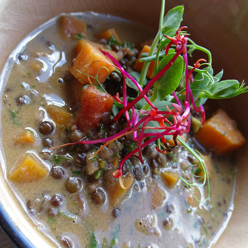 Fruchtiges Curry mit Belugalinsen und Kokosmilch: Curry mit Belugalinsen, Zwiebeln, Ingwer, Möhren, Süßkartoffeln, Blattspinat, Kokosmilch und Limetten (Portionsgröße 450 g, Mindestbestellmenge zehn Portionen)