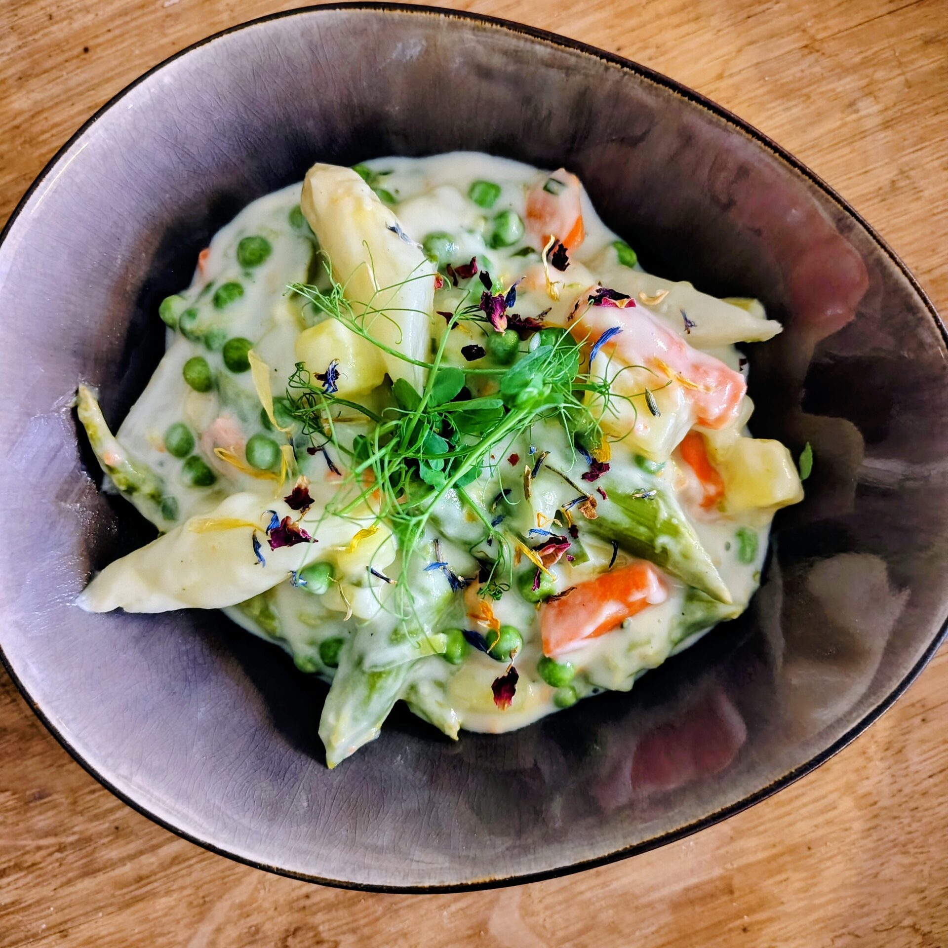 One Pot mit Spargel, Kartoffel, Erbsen und Möhren in cremiger Weißweinsoße (vegan).