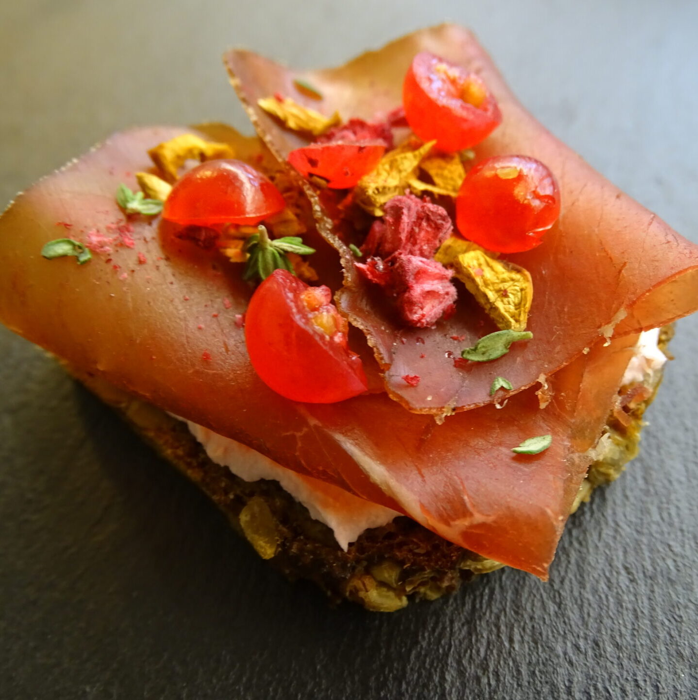Sauerteigbrot mit Wildschinken vom Hirsch, Preiselbeerfrischkäse und getrockneten Pfifferlingen.